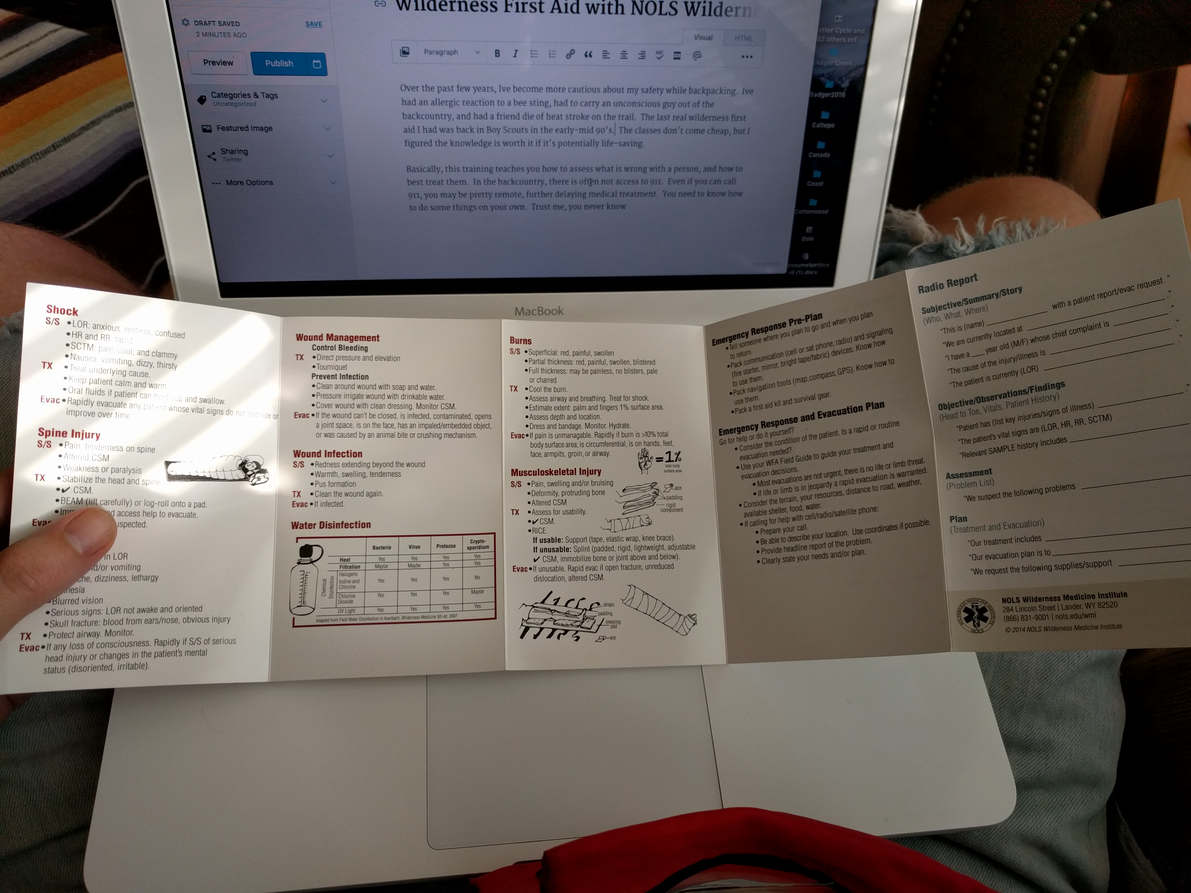 IMG_20160525_185722 May 26, 2016 Return to: Wilderness First Aid with NOLS Wilderness Medicine InstituteFull resolution (4032 × 3024) Image navigation Previous Image This guide should be with you, it has all the basics and will serve as a nice reminder of what to do if you need it.