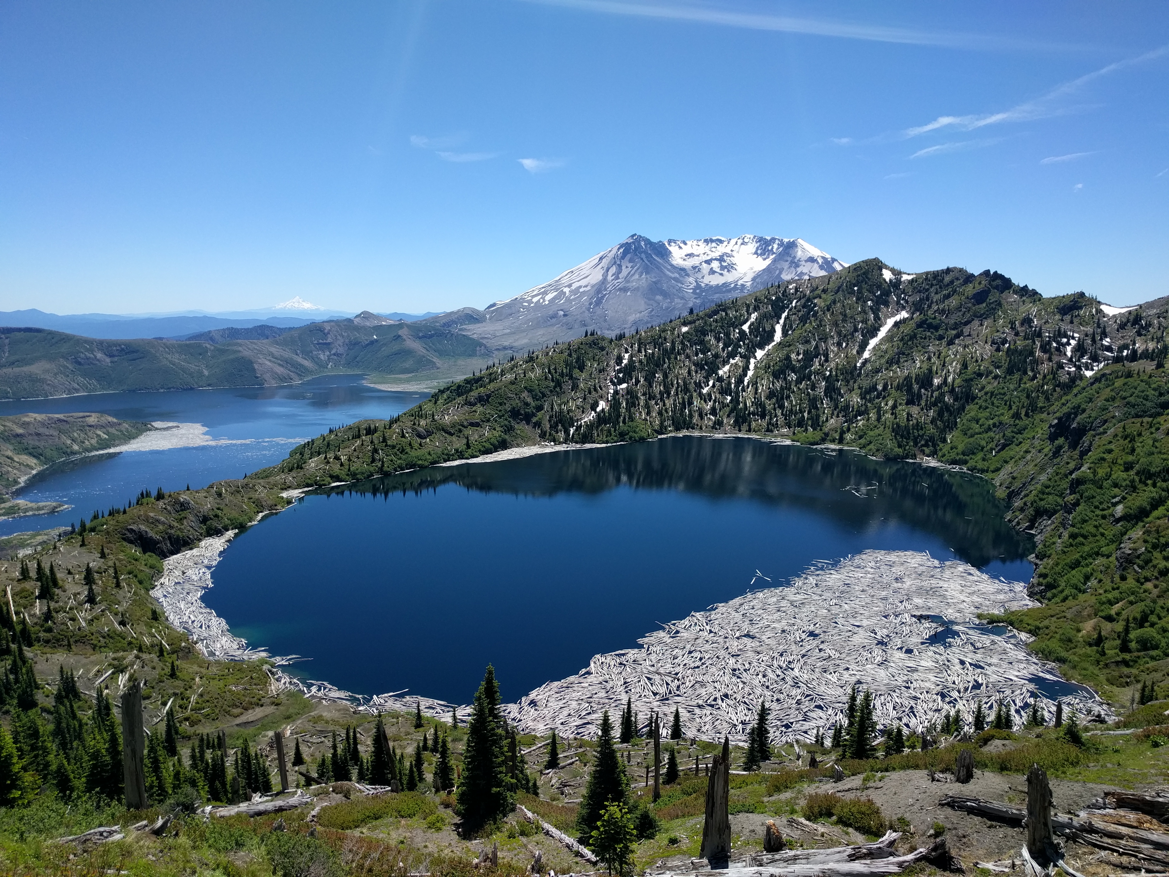 IMG_20160626_131829 June 27, 2016 Return to: Mt Margaret Backcountry in Mt St Helens Nat’l Monument Trip ReportFull resolution (4032 × 3024) Image navigation Previous Image Next Image St Helens Lake in foreground, Spirit Lake in the background. Those are 36 year old dead trees floating in the water.